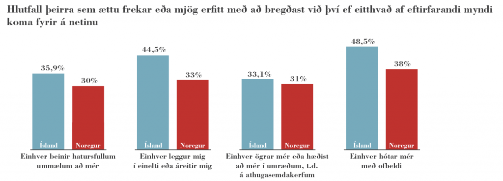 Einnig var spurt um neteinelti, háðung í athugasemdakerfum og hótanir um ofbeldi á netinu á sambærilegan hátt í þessari rannsókn og þeirri norsku. Í öllum atriðum var svarhlutfallið töluvert hærra á Íslandi en í Noregi. Aðeins 3% þátttakenda höfðu upplifað einelti eða áreiti á netinu í Noregi en 12,3% á Íslandi. Hlutfallslega helmingi fleiri höfðu upplifað háðung eða ögrun í umræðum/athugasemdum á Íslandi (11,5%) en í Noregi (5%). Þá sögðust 10% þátttakenda á Íslandi hafa upplifað hótanir um ofbeldi á síðustu 12 mánuðum en aðeins 2% í Noregi. „Mikilvægt er að kanna nánar af hverju þessi mikli munur stafar og af hverju Íslendingar telja sig verða mun frekar fyrir hatursfullum ummælum á netinu en Norðmenn,“ segir Elfa Ýr.